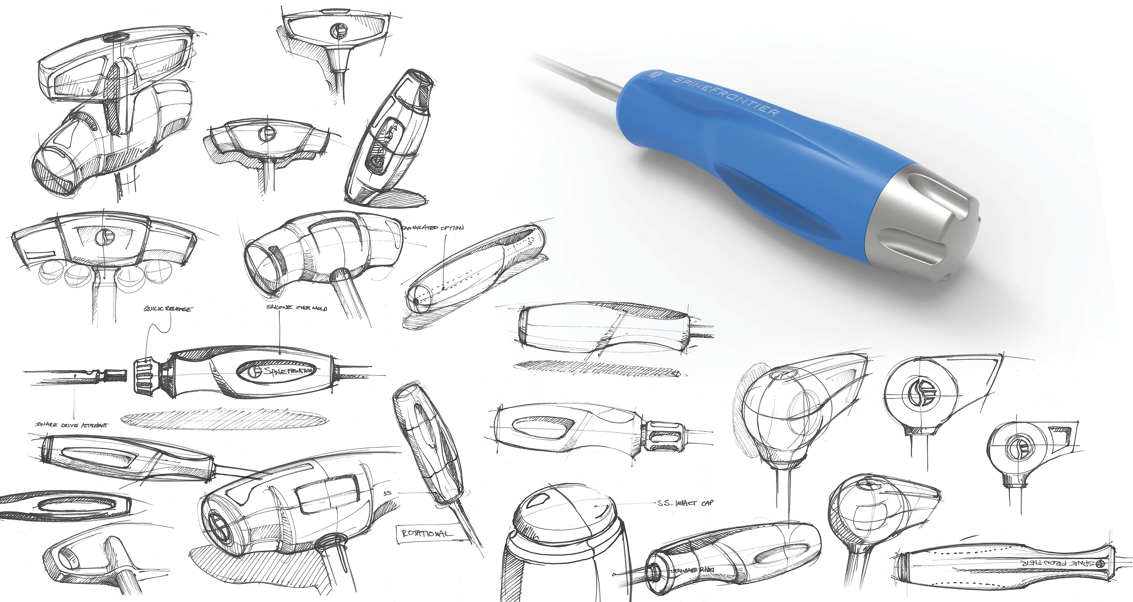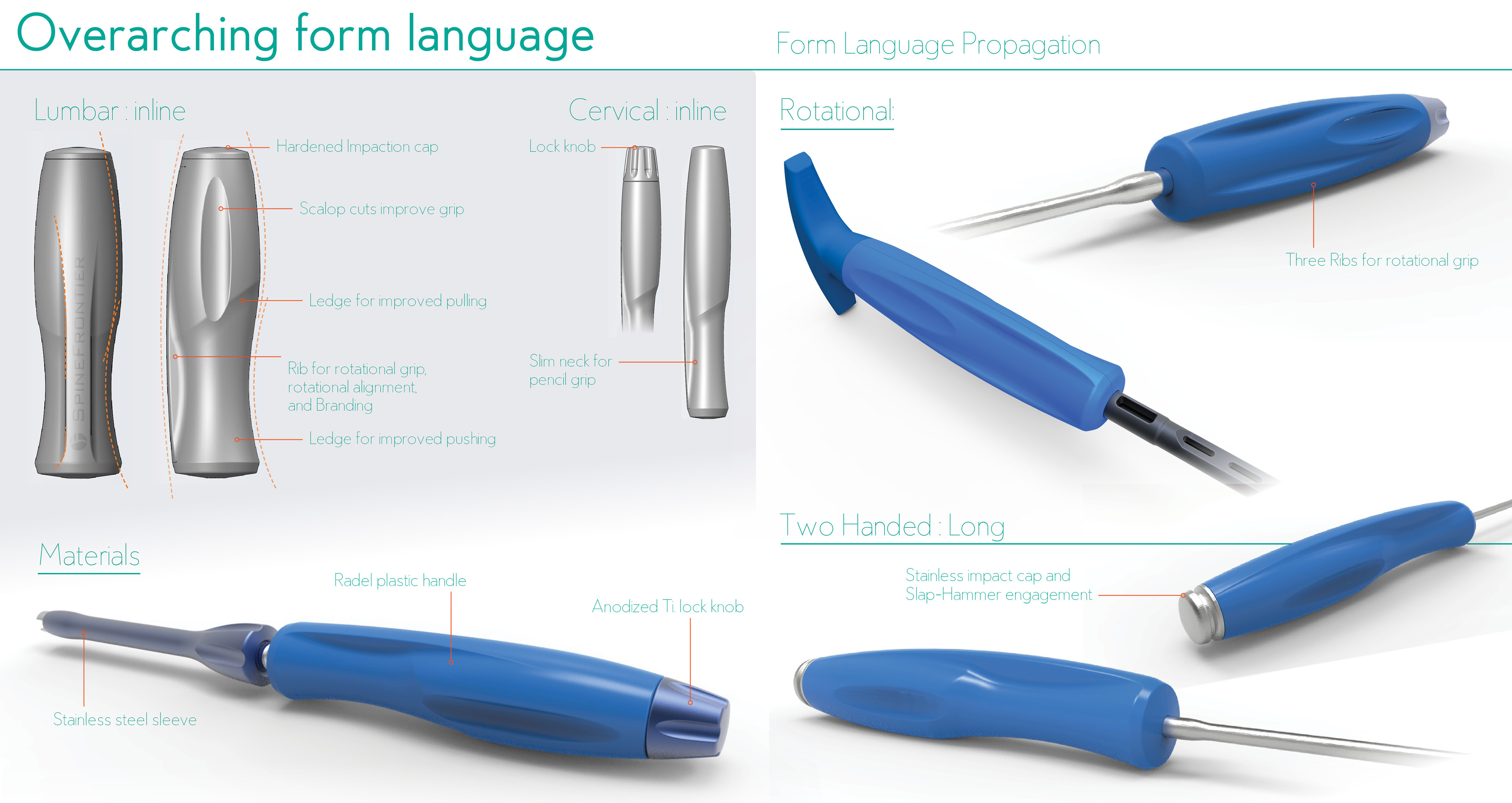 Lead the design of a cohesive brand language for all SpineFrontier Instruments. Implement injection molding solutions, and silicone over-molding.